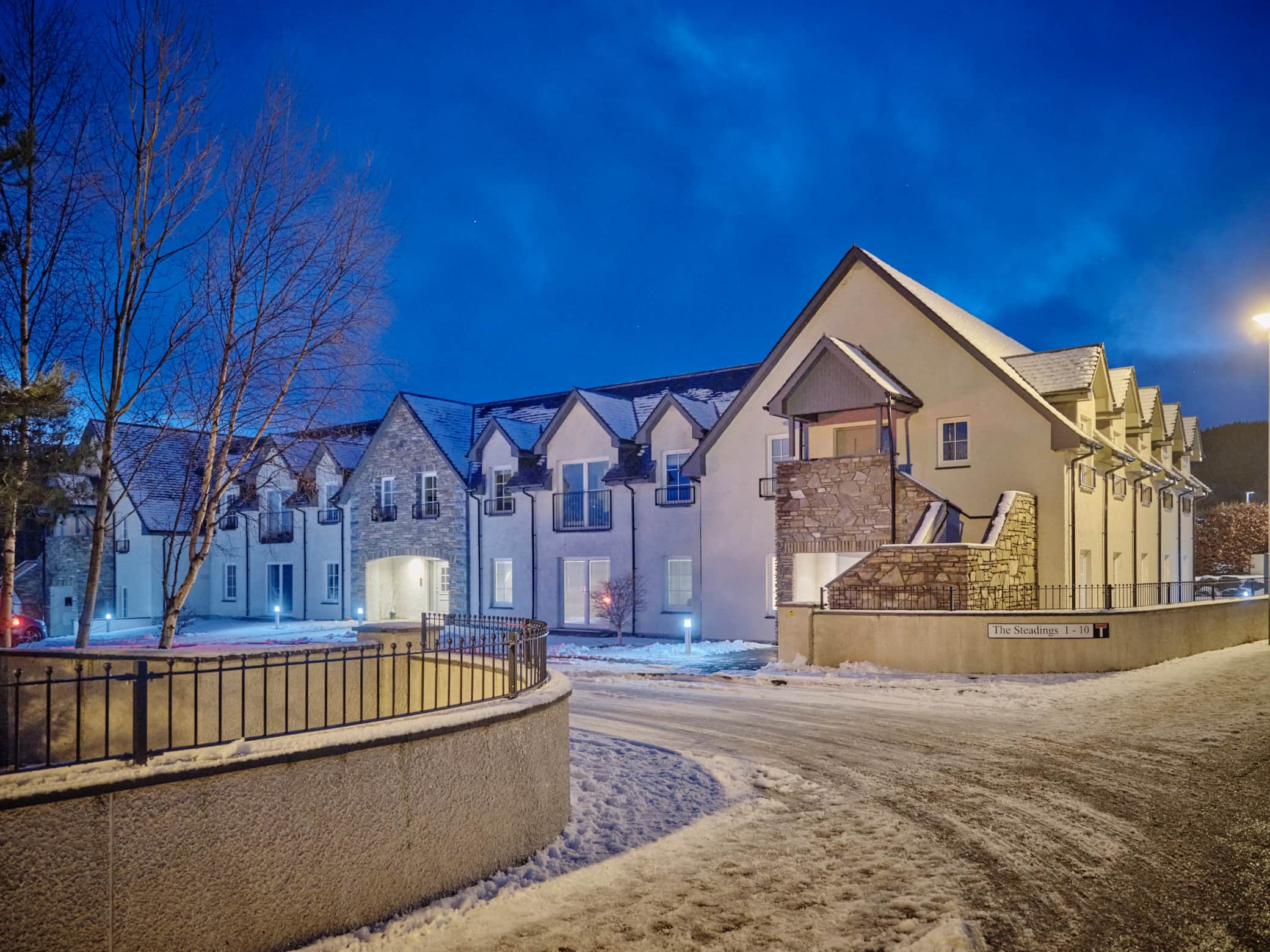 Postcode PH22 1NX. After exiting the A9 for Aviemore, No.1 The Steadings is about 1 mile on your left after Aviemore town centre, where you can take a left on Old Meall Road and then second on the left to the Steadings, where No.1 is the first apartment on the bottom right.