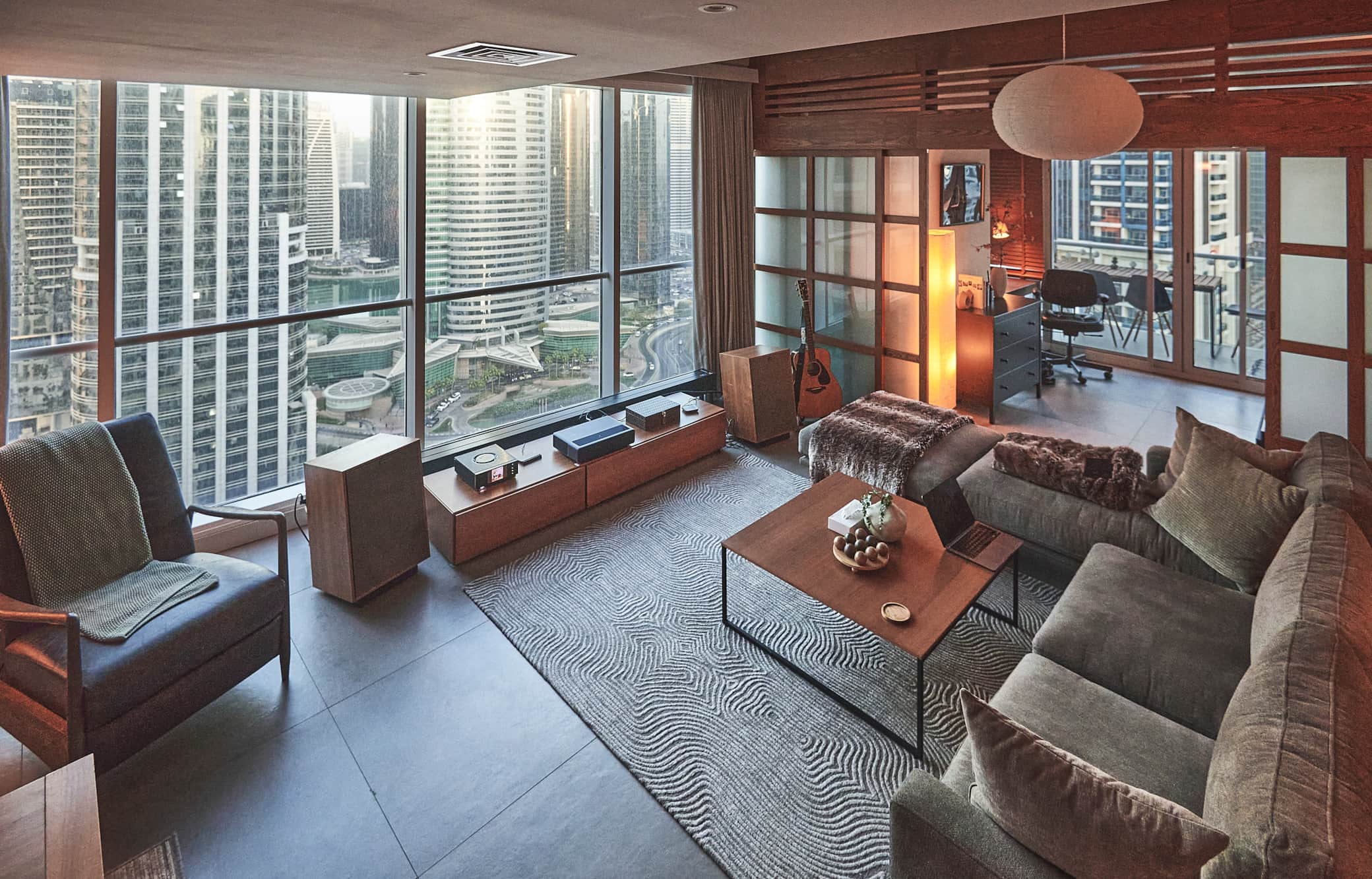 Expanisive stylish open-plan loft in JLT with Japandi-meets-Mid-century design. 🎵 Audiophile Hi-Fi, 🎬 4K cinema projector, ☕ bean-to-cup coffee, 🌐 smart home features, 🏋️♂️ gym & pool, and 📍 prime Marina/JBR location. Sleeps 6 comfortably, perfect for families, digital nomads & long-stay travellers. Just a 3-minute walk to the metro bridge to Dubai Marina.